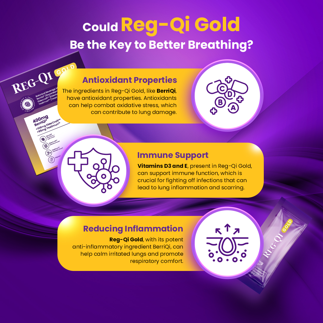 Modern respiratory health is increasingly threatened by constant exposure to pollutants, viruses, and allergens that disrupt the lung’s immune balance, causing overactive inflammation, tissue damage, and impaired breathing. BerriQi® forms the scientific foundation of Reg-Qi Gold, delivering a thoroughly researched mechanism for healing and recovery that stands out in respiratory support products.